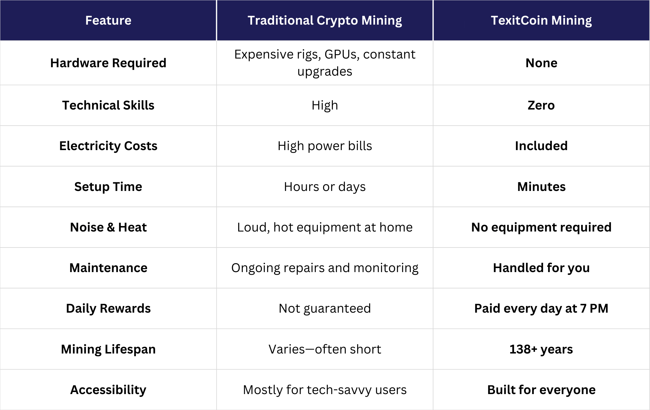 Traditional mining is complicated, expensive, and out of reach for most people. TexitCoin removes every barrier—so anyone can mine crypto and earn daily rewards without becoming a technician or buying a single piece of hardware.